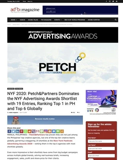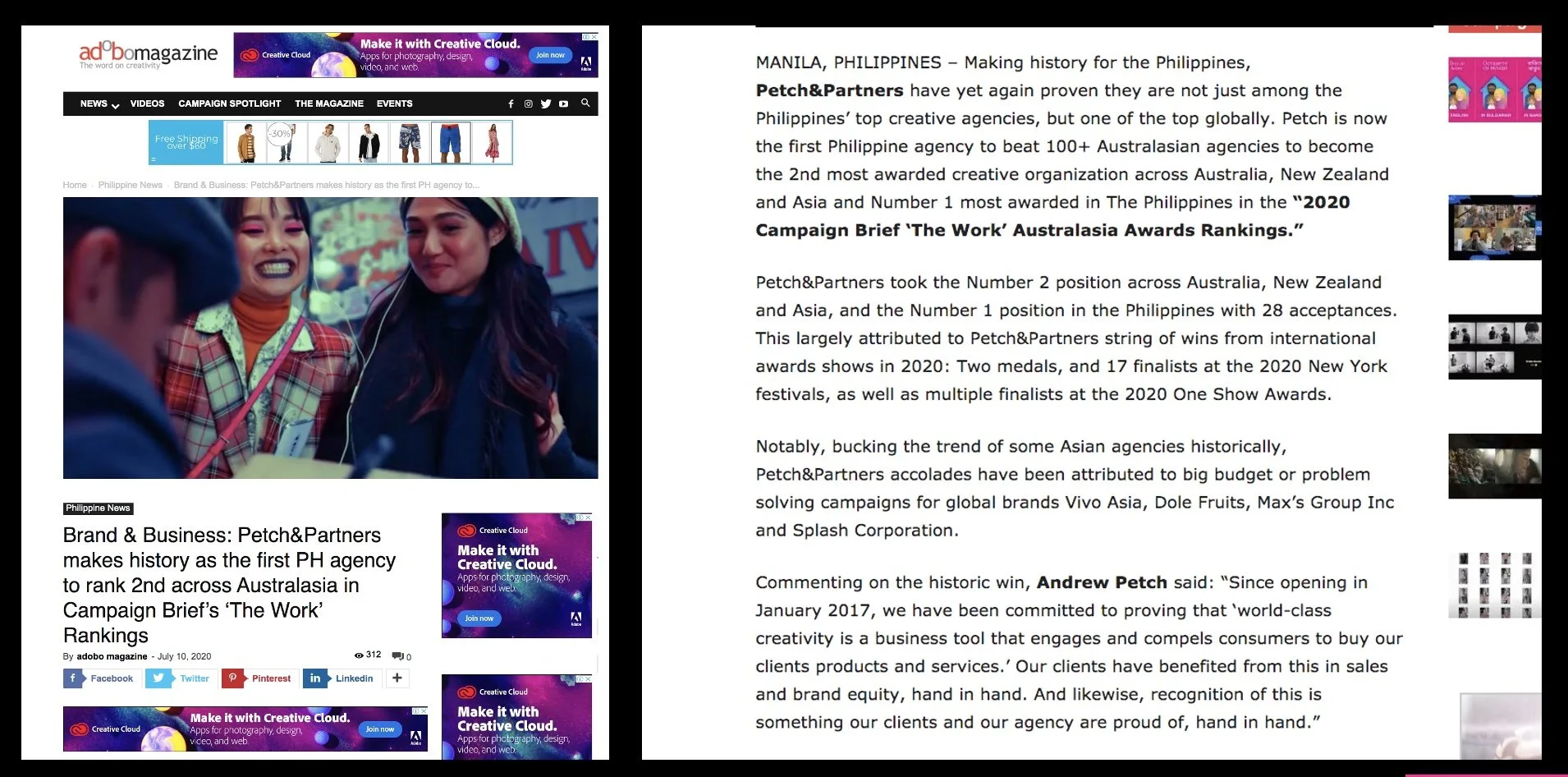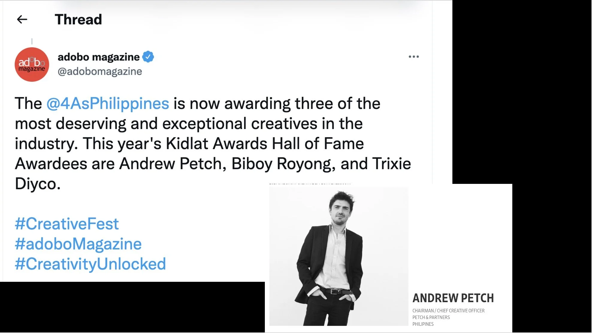 Chairman/Chief Creative Officer and Founder of Petch & Partners. Starting the agency in January 2017 with no clients – but a strong creative conviction – and in three short years they rose to become - Campaign Brief’s The Work 2020 Number 2 most awarded agency in Australasia - thanks to metals collected at One Show, New York Festivals, Clio, Ad Fest and Ad Stars - off clients they won against agencies 10 x their size - including Dole Fruits, Krispy Kreme, Nestle, Vivo Mobile Phones, Hilton Hotels, Resorts World, Max’s Restaurants and Smart Telecommunications,